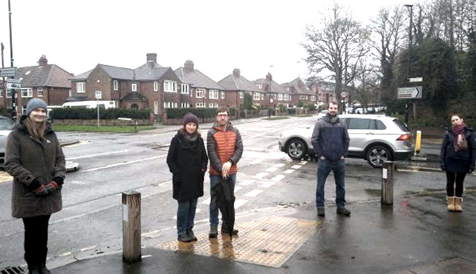 Pictured at the junction, from left, parents Sarah Fitsell and Ian & Lowra Kitchingman, Cllr Jonny Crawshaw and Knavesmire Head of School, Hannah Gibson Picture: George Dodd (From York Press 04/12/20)