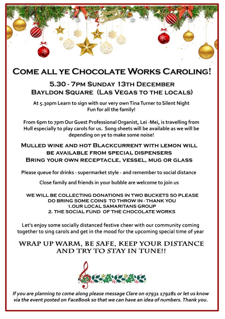 The Chocolate Works Social Group has organised carols, complete with mulled wine – see poster below. Contact Clare on 07931 179281 or register interest via the Facebook page so that they have an idea of numbers.
